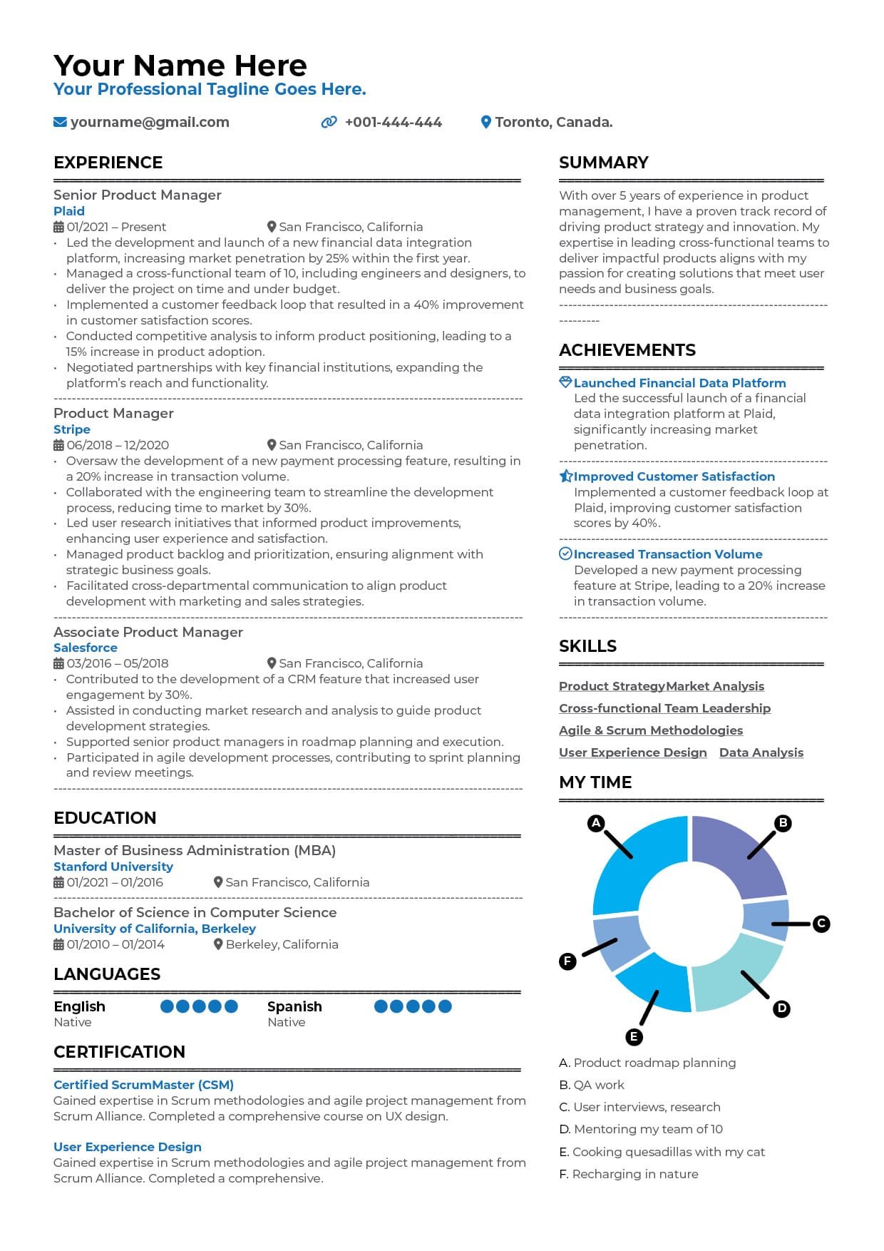 Presenting a professionally designed, ATS-optimized resume template crafted to elevate your job application game. Perfect for Product Managers, Tech Leads, Strategists, and other professionals seeking roles across leading global markets like the USA, Canada, Europe, and UAE. This template is engineered to address modern hiring practices while offering a sleek visual appeal that leaves a lasting impression on recruiters and hiring managers.